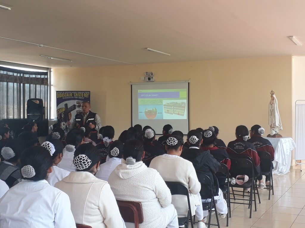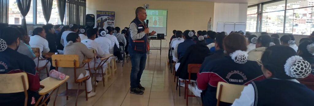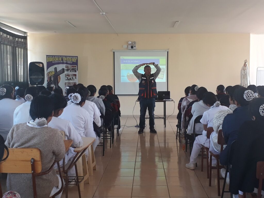 Prevención, respuesta y rehabilitación y mochila de emergencia… Esta fue la ponencia a cargo del Ing. Fermat Vargas Valencia (Jefe de la oficina de Gestión de Riesgos de Desastres, Municipalidad Distrital de Santiago) este viernes 24 de Mayo, dirigida a unos 150 alumnos del Instituto Didascalio Cristo Rey. Afianzó conocimientos, aclaró dudas y recuerda que: ¡Ante un desastre no se salvará el más fuerte, sino el que esté mejor preparado para cómo actuar y responder en forma adecuada para salvar vidas!